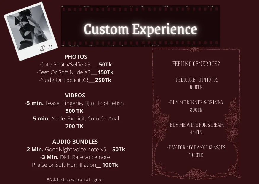 Anal, Spanking, Fingering, Dildo or Vibrator, Dirty Talk, Foot Fetish, Flashing, Jerk-off Instruction, Sex Toys, Masturbation, Nylon, Orgasm, Oil Show, Squirt, Heels, Cuckold, Humiliation, Doggy Style, Erotic Dance, Cock Rating, Role Play, Upskirt